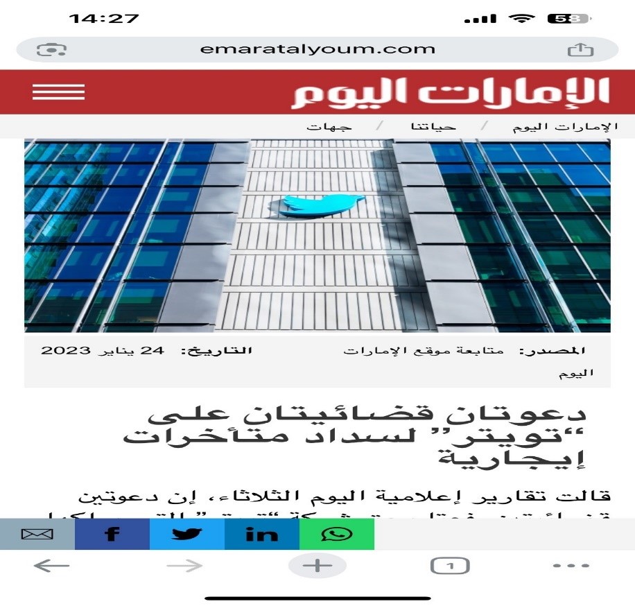 - في الرابع والعشرين من شهر كانون الثاني/ يناير عام ألفين وثلاثة وعشرين، ورد في موقع com خبر تحت عنوان “دعوتان قضائيّتان على تويتر لسداد متأخّرات إيجاريّة”. إنّ مثنّى كلمة “دعوى” هو “دعويان” لا “دعوتان”.